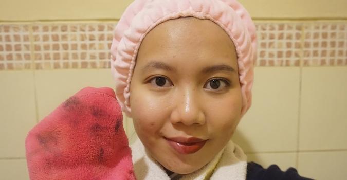 Setelah percobaan sekali berhasil, saya jadi penasaran bagaimana reaksi kulit saya yang acne-prone apabila menggunakan kain polyester ini sebagai ‘first cleanser’ selama seminggu. Selama eksperimen ini saya menggunakan full makeup yang terdiri dari foundation, liquid blush, bronzer, contour powder, brow pencil, brow setter, waterproof eyeliner, liquid shimmery eyeshadow, waterproof mascara, serta long wearing liquid lipstick yang dikenal sulit dihapus.