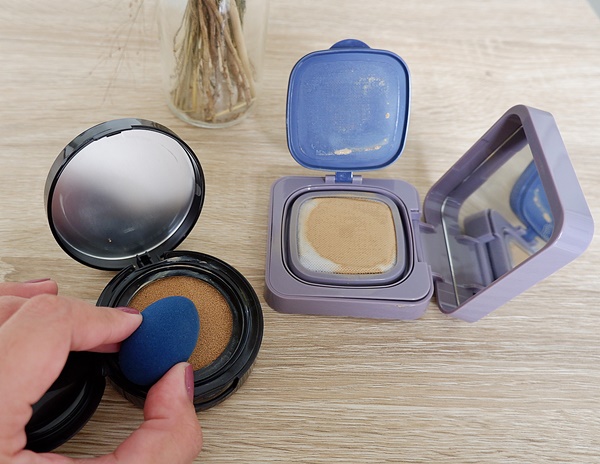 Untuk menurunkan coverage cushion, kita bisa memakainya dengan menggunakan beauty sponge. Beauty sponge yang memiliki pori-pori pada permukaannya, akan menghasilkan finish yang cenderung lebih sheer bila dibandingkan dengan cushion puff. Saya sendiri sih, jelas lebih suka hasil beauty sponge dibandingkan cushion puff. Lebih natural dan juga lebih cepat meratakan produk.