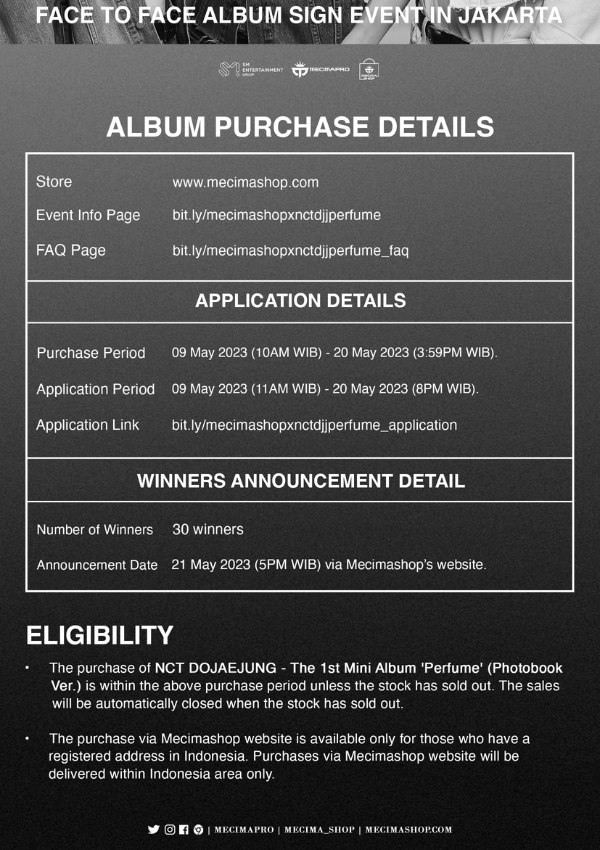 Acara yang bertajuk ‘Face to Face Album Sign Event in Jakarta’ ini mengharuskan kamu untuk melakukan pembelian album ‘Perfume’ di website Mecima Pro. Lalu, dari pembelian tersebut, sebanyak 30 orang akan mendapatkan kesempatan untuk memenangkan tiket fan sign offline. Kali ini, sistemnya nggak seperti fan sign online biasanya yang diundi. Jadi, bagi siapapun yang bisa membeli album dengan jumlah tertinggi, maka akan berkesempatan lebih besar untuk bertemu ketiga cowok ganteng dari NCT ini.