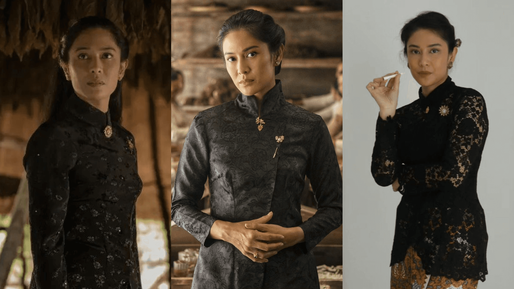 Jeng Yah dalam balutan kebaya berwarna hitam memang sangat sempurna. Pada beberapa scene dalam serial ‘Gadis Kretek’, Dian Satrowardoyo mengenakan sebuah kebaya berwarna hitam dengan model leher yang tinggi, serta dihiasi ornamen floral yang membuatnya tampak elegan, sekaligus fearless. Ia juga memakai aksesori berbentuk floral, serta kupu-kupu di bagian dadanya.