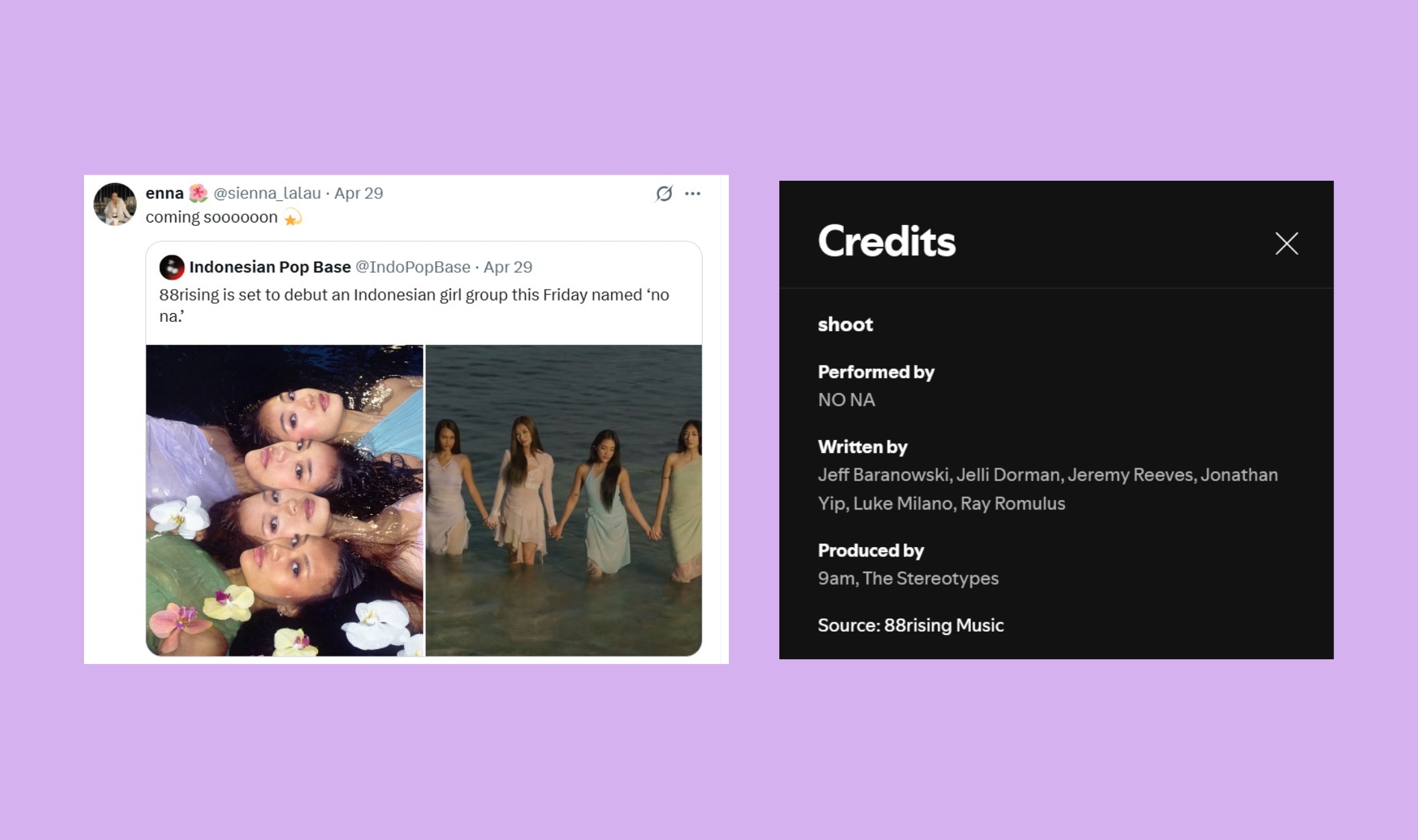 Debut di bawah naungan 88rising yang memang sudah punya fans di pasar musik internasional, tentu yang excited sama kehadiran no na bukan hanya dari Indonesia lho. Di kolom komentar MV mereka di YouTube terpantau juga banyak penggemar dari negara tetangga, seperti Thailand dan Filipina yang memberikan respon positif.