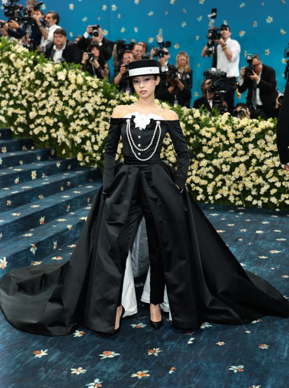 Kembali hadir di Met Gala tahun ini, Jennie terlihat memberikan aura dandy tanpa menghilangkan aura chic yang dimilikinya. Ia memilih menggunakan gaun off shoulder hitam putih dari Chanel dan mengenakan topi yang senada dengan look yang structured. Pada bagian tengah dadanya dihiasi bunga camelia putih khas Chanel dan mutiara yang menjuntai. Gaun yang dikenakannya ini terinspirasi dari Coco Chanel runway era 1920-an hingga 1930, di mana pada era ini gaun dikombinasikan dengan jumpsuit.