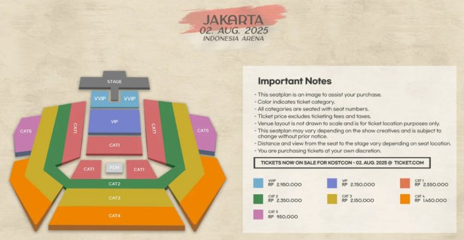 Terdapat 7 kategori, dengan tempat duduk all seated. Berikut adalah daftar harga yang sudah include dengan pajak dan biaya lainnya.