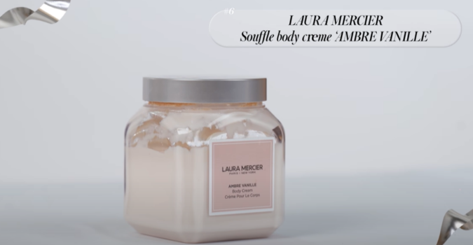 Selanjutnya, ada body butter yang selalu dibawa kemana-mana dalam bentuk jar. Ia menggunakan Laura Mercier Souffle Body Creme Ambre Vanille. “Ada sedikit wangi vanilla dan kelapa, ini bagus banget buat pelembap, dan wanginya tahan lama, bisa sampai sehari setelahnya. Setelah mandi kalau pakai di tubuh, rasanya seperti dibaluti wewangian,” ujarnya. Ia juga menyampaikan jika di musim dingin, pelembap ini sering digunakan.