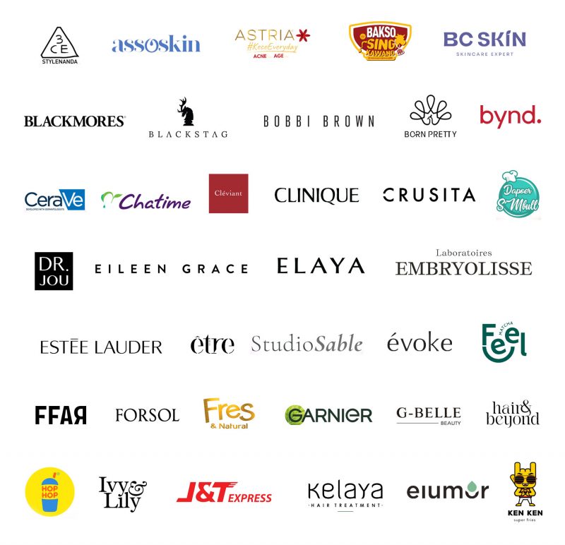 Masih ada 3CE, Assosskin, Astria, Bakso Sapi Singkawang, BC Skin, Blackmores, Blackstag, Bobbi Brown, Born Pretty, BYND, Cerave, Chatime, Cleviant, Clinique, Crusita, Dapoer S-Mbull, Dr. Jou, Eileen Grace, Elaya, Embryolisse, Estee Lauder, Etre, Studio Sable, Evoke, Feel Matcha, FFAR, Forsol, Fres & Natural, Garnier, G-Belle Beauty, Hair & Beyond, Hop Hop, Ivy & Lily, Kelaya, Elumor, dan Kenken Superfries.