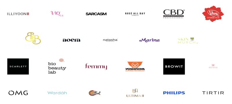 Lanjut, ada Illiyoon, Vio, Sarcasm, Rose All Day, CBD, Viva, Blissbeau, Aoera, Natasha, Marina, Skin Murch, Scarlett, Bio Beauty Lab, Femmy, Yoshinoya, Browit, Emina, OMG, Wardah, Ultima II, Philips, Tirtir, dan Mentai Street.