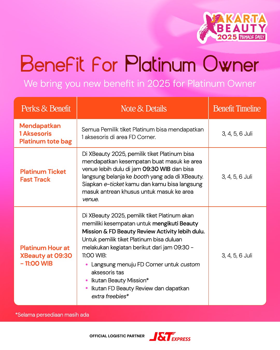Nah, ini salah satu highlight yang nggak ada di tahun lalu. Yup, platinum hour! Khusus buat pemilik platinum ticket, kamu bisa belanja lebih puas karena bakal ada jam khusus untuk kamu masuk duluan ke JxB. Yes, kamu bisa masuk ke venue mulai dari jam 09.30 yang artinya 30 menit lebih cepat dari pengunjung lainnya! Jadi, kamu bisa langsung mampir ke booth yang diincar dan nggak perlu rebutan diskon karena nggak menutup kemungkinan bahwa ada brand yang memberikan promo khusus di jam tersebut. Menarik, kan?