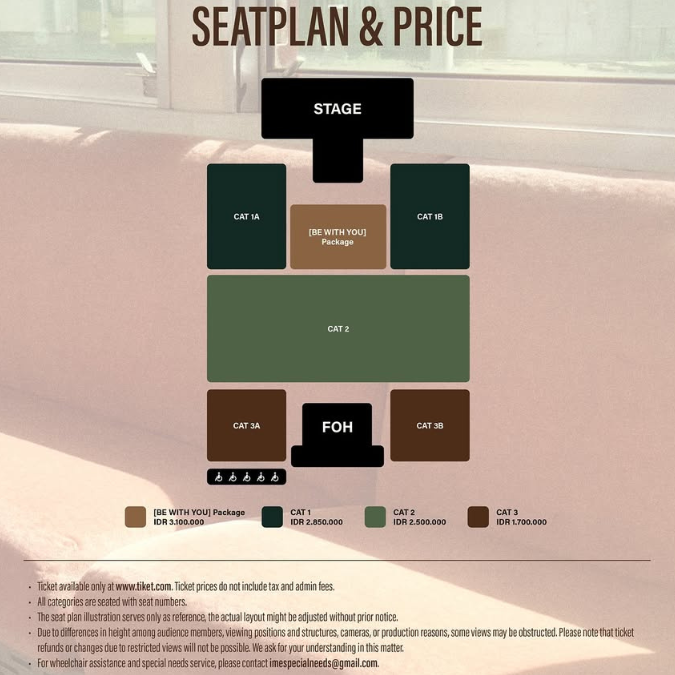 Tentu harga di atas belum termasuk pajak 10% dan biaya administrasi lainnya. Menariknya, untuk paket [BE WITH YOU] akan mendapatkan benefit berupa tempat duduk yang berada persis di depan panggung, 1:2 group photo bersama Park Bo Gum, postcard set dengan tanda tangan, hi bye session dan poster. Sementara, untuk kategori lainnya tetap bisa mengikuti hi bye session dan mendapatkan poster.