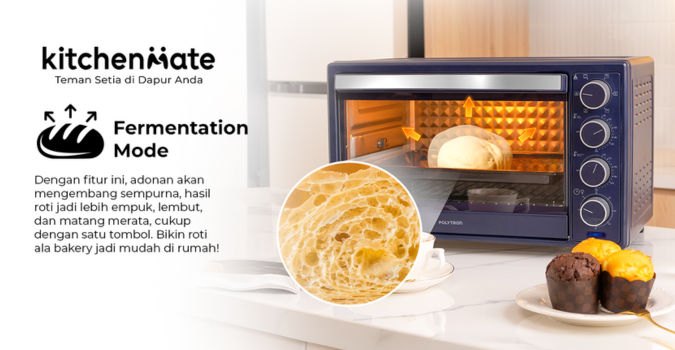 Kitchenmate Oven Listrik Low Watt terbaru hadir dengan Fermentation Mode yang memungkinkan adonan mengembang sempurna hanya dengan satu tombol. Hasil roti jadi lebih empuk, lembut, dan matang merata. Membuat roti ala bakery kini menjadi lebih mudah dilakukan di rumah.