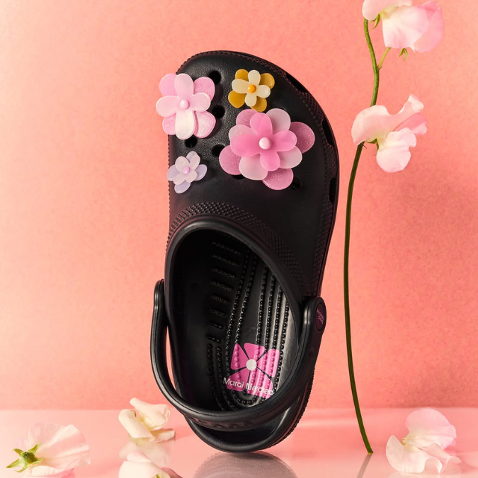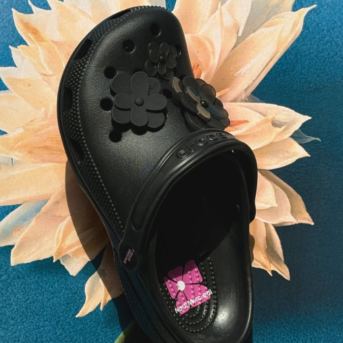 Kolaborasi Mardi Mercredi x Crocs Classic Clog hadir dengan sentuhan playful khas Mardi Mercredi lewat detail signature flower yang ditampilkan dalam bentuk Jibbitz charms. Ada tujuh desain bunga yang bisa dikombinasikan sesuka hati untuk memperkuat personal style kamu. Koleksi ini tersedia dalam dua warna yakni Black/Black dan Black. Versi Black/Black tampil sleek dengan nuansa hitam menyeluruh, cocok buat kamu yang suka look minimalis. Sementara versi Black hadir dengan aksen bunga warna pink dan kuning yang lebih pop dan cheerful. Dua-duanya tetap kasih ruang buat kamu berekspresi sesuai selera.