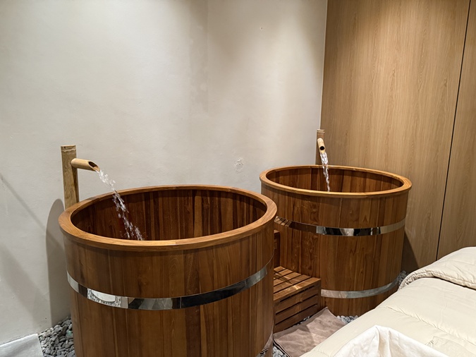Selain berbagai pilihan onsen powder, ada juga tiga opsi massage oil dengan aroma yang calming. Saya memilih Hikari yang menggabungkan Tea Tree, Cedarwood, Cherry Blossom, Ylang-ylang, dan Green tea essential oil. Dua oil lainnya adalah Neruhana (Capaiba, Jasmine, Neroli, Sandalwood) dan Shinko (Green tea, Cedarwood, Vanilla, Yuzu, Bergamot, Mint).