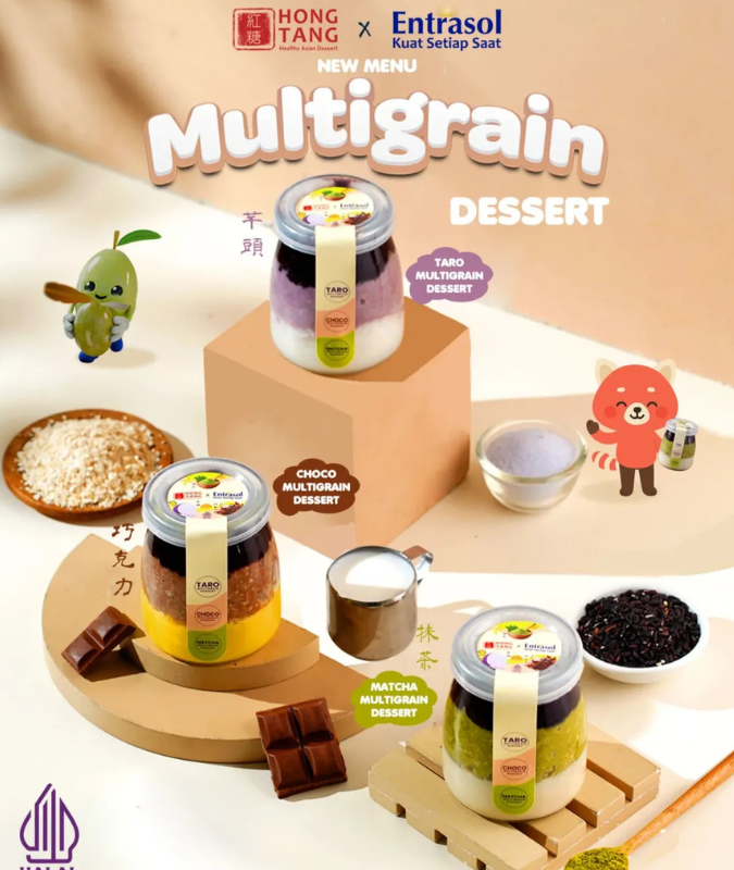 Hong Tang x Entrasol Multigrain Dessert Series menghadirkan 3 menu eksklusif yaitu Matcha Multigrain Dessert, Taro Multigrain Dessert, dan Choco Multigrain Dessert, yang memadukan cita rasa khas Hong Tang dengan manfaat multigrain oatmeal dari Entrasol. Mengandung kebaikan ekstrak buah zaitun, tinggi serat, serta sumber protein dan karbohidrat kompleks, setiap menu dirancang sebagai healthy pleasure bagi siapapun yang ingin menikmati dessert tanpa rasa bersalah.