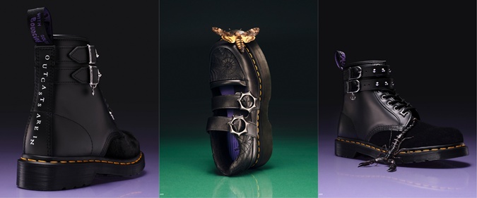 Yang paling mencuri perhatian tentu saja Jadon Wednesday Boot, versi artistik dari boot chunky klasik Dr. Martens dengan bordir kaca patri dan aksen ungu misterius. Buat kamu yang suka sesuatu yang lebih statement, ada 1460 Wednesday Boot dalam material beludru hitam dan kulit Nappa Lux, lengkap dengan strap berdetail stud perak dan pesan “OUTCASTS ARE IN” di bagian belakang.