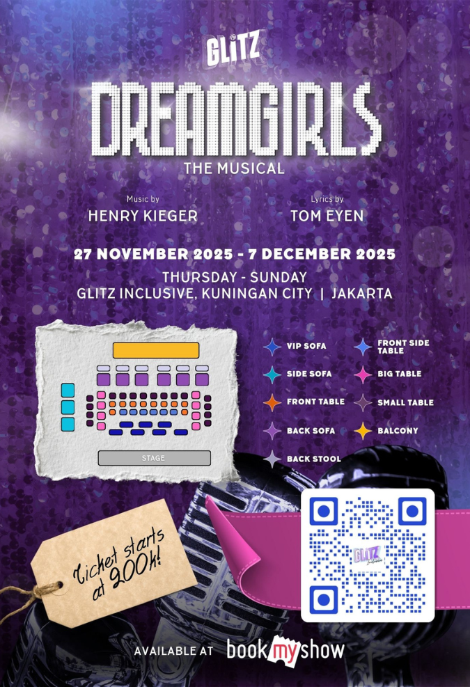 Dreamgirls The Musical by Glitz Production akan dipentaskan mulai 27 November hingga 7 Desember 2025 di Glitz Inclusive, Jakarta, dengan total sepuluh pertunjukan selama delapan hari. Produksi ini berlisensi resmi dari Concord Theatricals, dan tiket sudah bisa dibeli melalui BookMyShow serta TipTip dengan harga mulai dari Rp200.000.