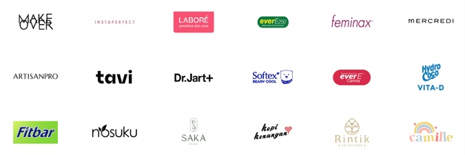 Next, ada Make Over, Instaperfect, Labore, Ever-E, Feminax, Mercredi, Artisan Pro, Tavi, Dr. Jart, Softex, Ever-E Calmia, Hydro Coco, Fitbar, Nosuku, SAKA, Kopi Kenangan, Rintik Skincare dan Camille Beauty.