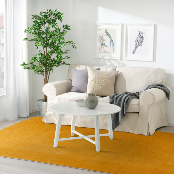Cukup tambahkan satu atau dua elemen yang memberi lapisan visual tanpa membuat ruang terasa penuh. Karpet lembut seperti AVLOPPSBRUN atau BUSSFIL membantu mendefinisikan area duduk, sementara baki putih ROMANTISK dapat digunakan untuk menata lilin atau dekorasi kecil agar tampilan meja lebih rapi dan harmonis.