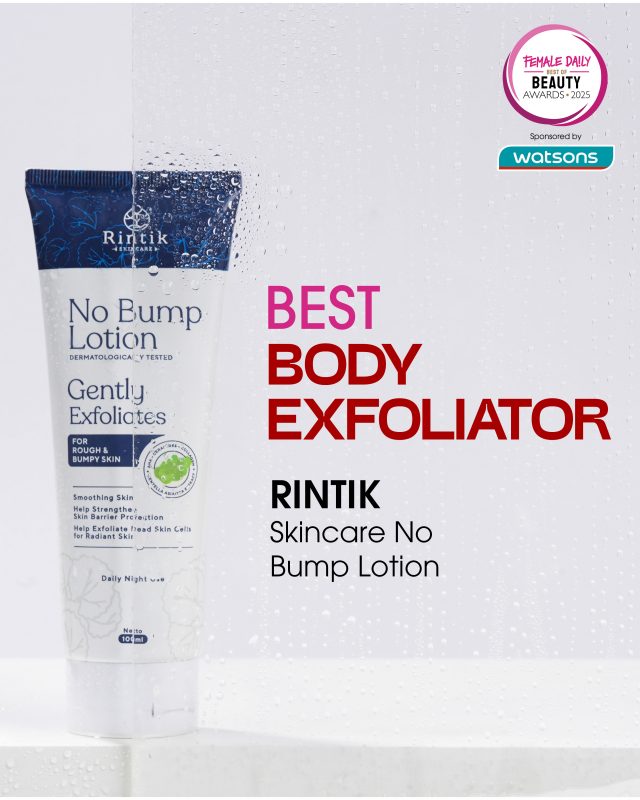 Mengeksfoliasi kulit tuh nggak harus pakai scrub karena ada formula lain seperti yang dimiliki Rintik Skincare! No Bump Lotion memenangkan kategori Best Body Exfoliator berkat formulanya yang dirancang khusus untuk membantu mengatasi masalah kulit berbintik, tekstur kasar, dan ingrown hair. Teksturnya juga bukan scrub yang kasar, melainkan lotion yang gampang di-apply, serta sat-set untuk dipakai.