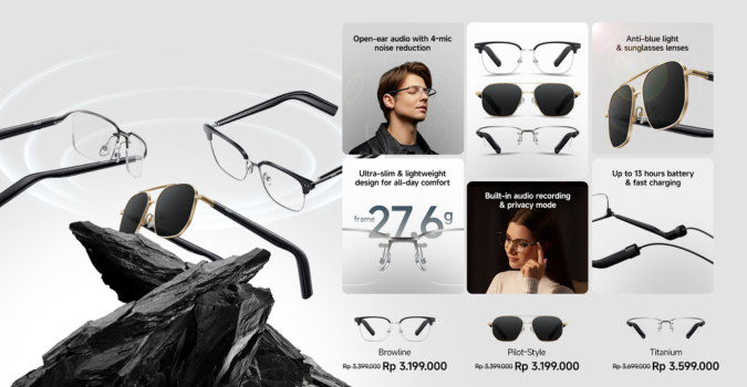 Hadir dalam tiga varian yaitu Titanium, Pilot-Style, dan Browline, device ini mengutamakan kenyamanan sekaligus ketahanan. Model Titanium menonjolkan bingkai ultra-ringan seberat 27,6g, sementara varian Browline dan Pilot-Style dilengkapi mekanisme quick-release untuk kemudahan berganti gaya. Dari sisi lensa, varian Browline dan Titanium dilengkapi pelindung cahaya biru 25%, sedangkan Pilot-Style menggunakan lensa kacamata hitam dengan perlindungan UV400 hingga 99,99%. Ketangguhannya pun terjamin berkat engsel piano-wire yang tahan hingga 15.000 lipatan serta sertifikasi IP54 yang tahan debu dan percikan air.