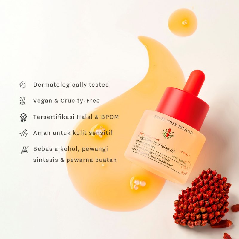 Papua Red Fruit Plumping Lightweight Oil juga dilengkapi bisabolol untuk membantu menenangkan kulit dan mengurangi kemerahan, serta ada 5 botanical oils, sunflower, green tea, safflower, olive, dan rose, yang tinggi kandungan omega 3-6-9 serta antioksidan alami. Semua kandungan ini juga makin dikuatkan dengan adanya LUMERA™ Papua Red Fruit Extract, teknologi ekstrak buah merah Papua yang dipatenkan From This Island dan diklaim mengandung antioksidan hingga 128 kali lebih tinggi dibanding brewed green tea.