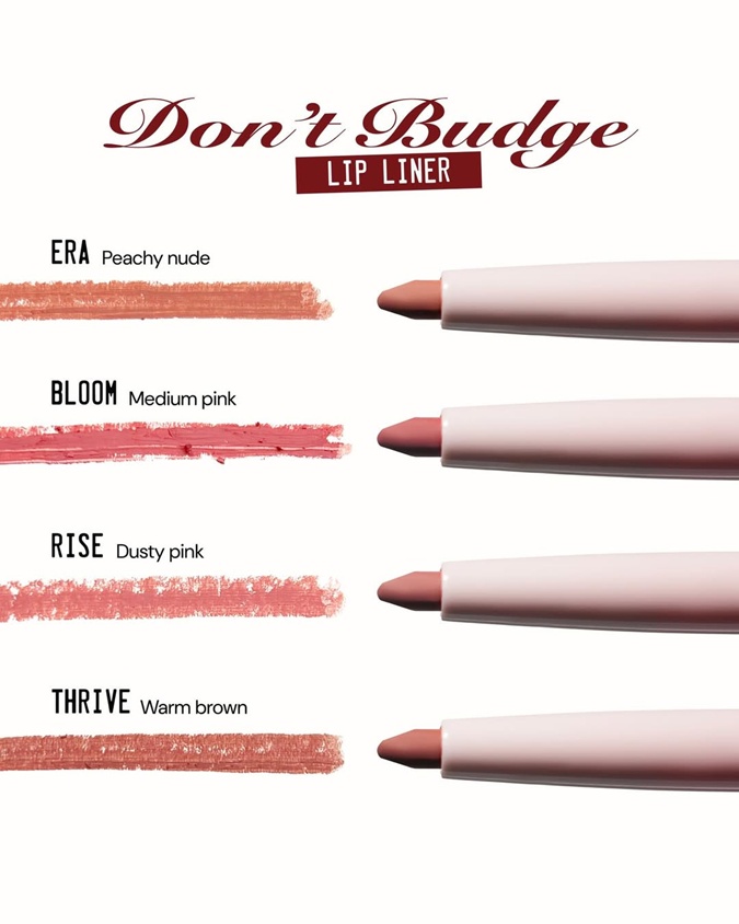 Yang sudah lama ditunggu-tunggu, akhirnya datang juga! Rose All Day baru saja merilis empat shades Don’t Budge Lip Liner. Tekstur creamy matte-nya glides on halus saat diaplikasikan, tanpa terasa ketarik atau patah-patah. Pigmentasinya intens, bantu kamu membentuk garis bibir dengan rapi, mudah di-blend, dan bikin lip shape sesuai look yang kamu mau. Dilengkapi sharpener untuk hasil garis yang clean serta soft brush yang bisa kamu pakai untuk blend garis luar bibir agar terlihat blurry. Formulanya diperkaya Peptide agar bibir tampak lebih halus dan plump, serta Vitamin E yang menjaga bibir tetap nyaman dan lembap sepanjang hari.