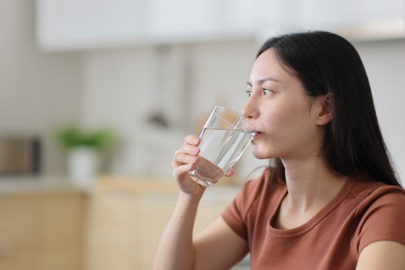 Asian woman drinking tap water from glass in the kitchen