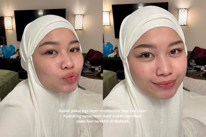 Setelah menyadari kesalahan tersebut, di sisa perjalanan, aku langsung fokus memperbaiki kondisi kulit. Aku mulai rutin menggunakan sunscreen dari Wardah yang terasa lebih melembapkan, serta selalu re-apply moisturizer setelah wudhu. Untuk menjaga kelembapan dan mengurangi rasa perih, aku bahkan menggunakan tiga layer moisturizer dan dua layer sunscreen.