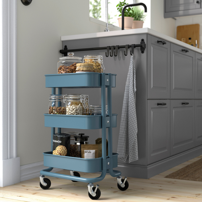 Meja utama sering menjadi pusat semua hidangan, mulai dari minuman hingga makanan berat. Kondisi ini membuat tamu sulit bergerak dan tuan rumah kerepotan mengatur ulang sajian. Pembagian fungsi meja dapat membantu. Meja tambahan berukuran ringkas atau troli serbaguna seperti RÅSKOG bisa dimanfaatkan untuk memisahkan minuman dan kudapan dari hidangan utama. Dengan distribusi yang lebih rapi, alur pergerakan tamu menjadi lebih lancar.
