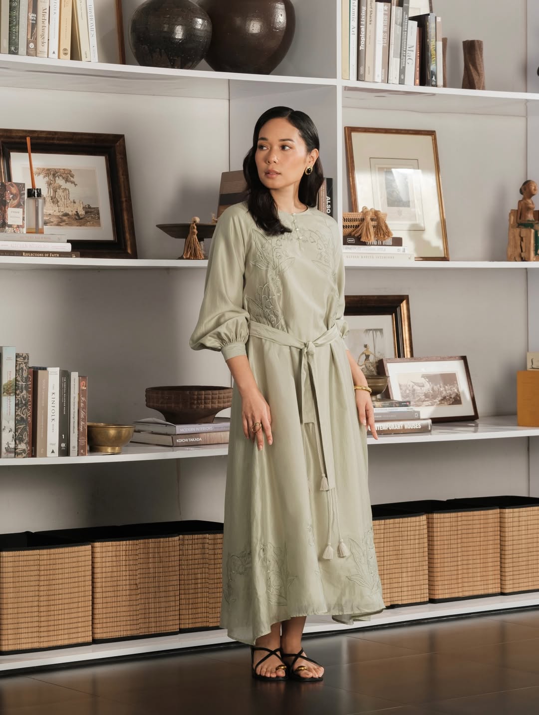 Midi dress dengan bordir dan belt tassel yang versatile.
