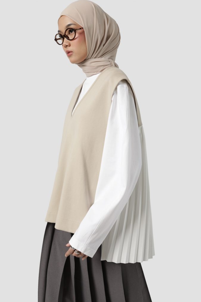 Detail pleats di belakang bikin vest ini mudah buat di-dress up and down.