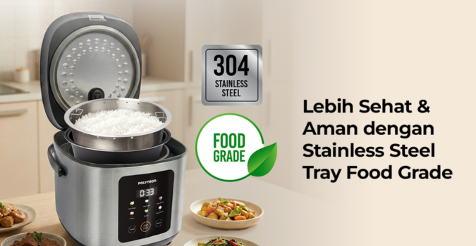 Dari sisi desain dan material, Polytron juga cukup memperhatikan detail. Tray stainless steel food grade 304 digunakan khusus untuk proses low carbo dan kukus, sehingga aman sekaligus mendukung proses pengurangan kadar gula pada nasi. Sementara itu, inner pot-nya sudah dilengkapi lapisan anti lengket, jadi lebih gampang dibersihkan setelah digunakan.