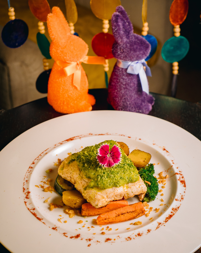 Menu à la carte Springtime Easter Feast dirancang dengan inspirasi dari cita rasa dan tradisi Paskah, menghadirkan kombinasi familiar dalam pendekatan yang lebih segar. Salah satu hidangan unggulan adalah Tiramisu Filled Easter Egg, di mana cangkang cokelat buatan tangan dibuka langsung di meja untuk mengungkap isian tiramisu yang rich dan lembut.