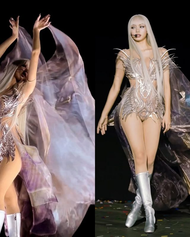 Di atas bodysuit-nya, Lisa melayer dengan outer sheer berwarna pastel keunguan yang panjang dan super flowy. Ini adalah elemen yang paling bikin penonton takjub karena setiap kali Lisa berjalan atau bergerak, kain itu ikut melayang-layang dengan dramatis dan menciptakan efek visual seolah-olah dia punya sayap atau dikelilingi aura ethereal.