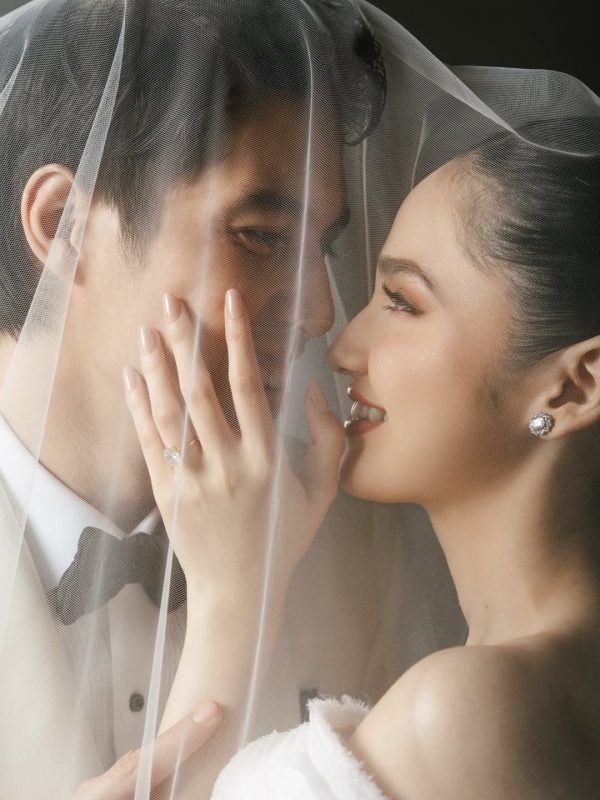 Satu hal yang langsung jadi highlight dari sesi prewedding studio ini adalah konsep mereka yang bermain dengan latar hitam pekat dan sentuhan tangan Nicoline Patricia Malina sebagai fotografer! Background gelap yang solid memberikan kontras tajam terhadap busana serba putih El dan Syifa, sehingga setiap detail kain, tekstur, dan ekspresi wajah tampil jauh lebih tegas dan dramatis. Sesi prewedding pun nggak melibatkan properti berlebihan, hanya fokus pada dua sejoli ini satu cahaya yang diarahkan dengan presisi, sehingga chemistry mereka terlihat makin kuat.