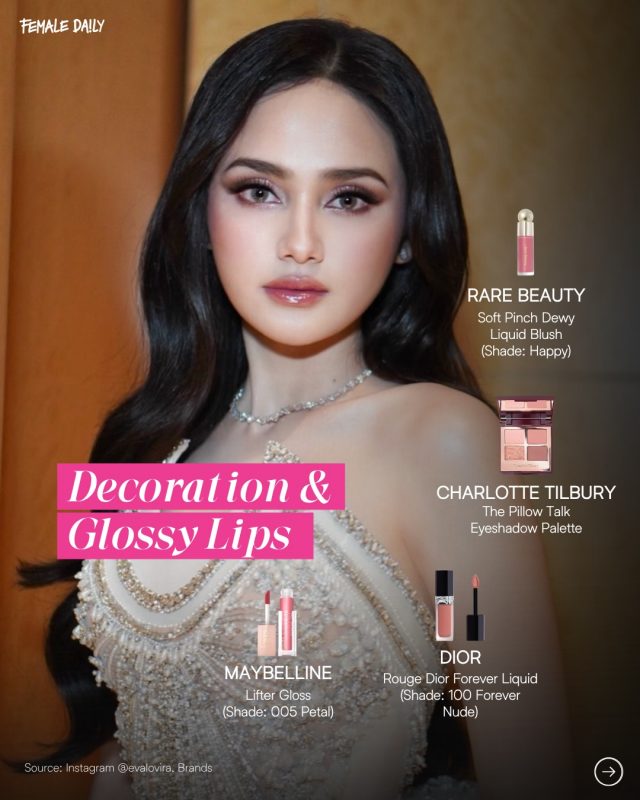 Eva Lovira mengandalkan kombinasi Haus Labs Beauty dan Armani Luminous Silk Foundation untuk menciptakan base yang luminous dan skin-like. Untuk blush, ia mengaplikasika Rare Beauty Liquid Blush shade Happy yang pas banget di wajah Syifa karena menghasilkan flush pink natural yang fresh dan glowy. Semuanya di-set dengan Suqqu Loose Powder supaya tahan sepanjang acara.